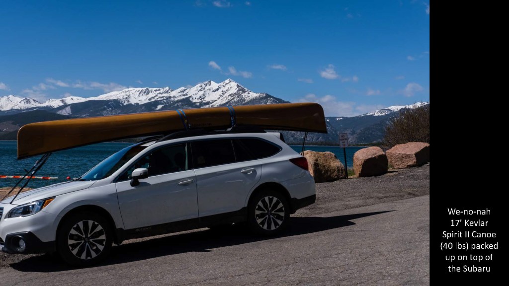 That trip to Dillon Reservoir last year sure made us want to be able to get out on the water. So the next spring saw a new-to-us used 17′ Wenonah canoe on the car rack. We also adopted a new puppy…